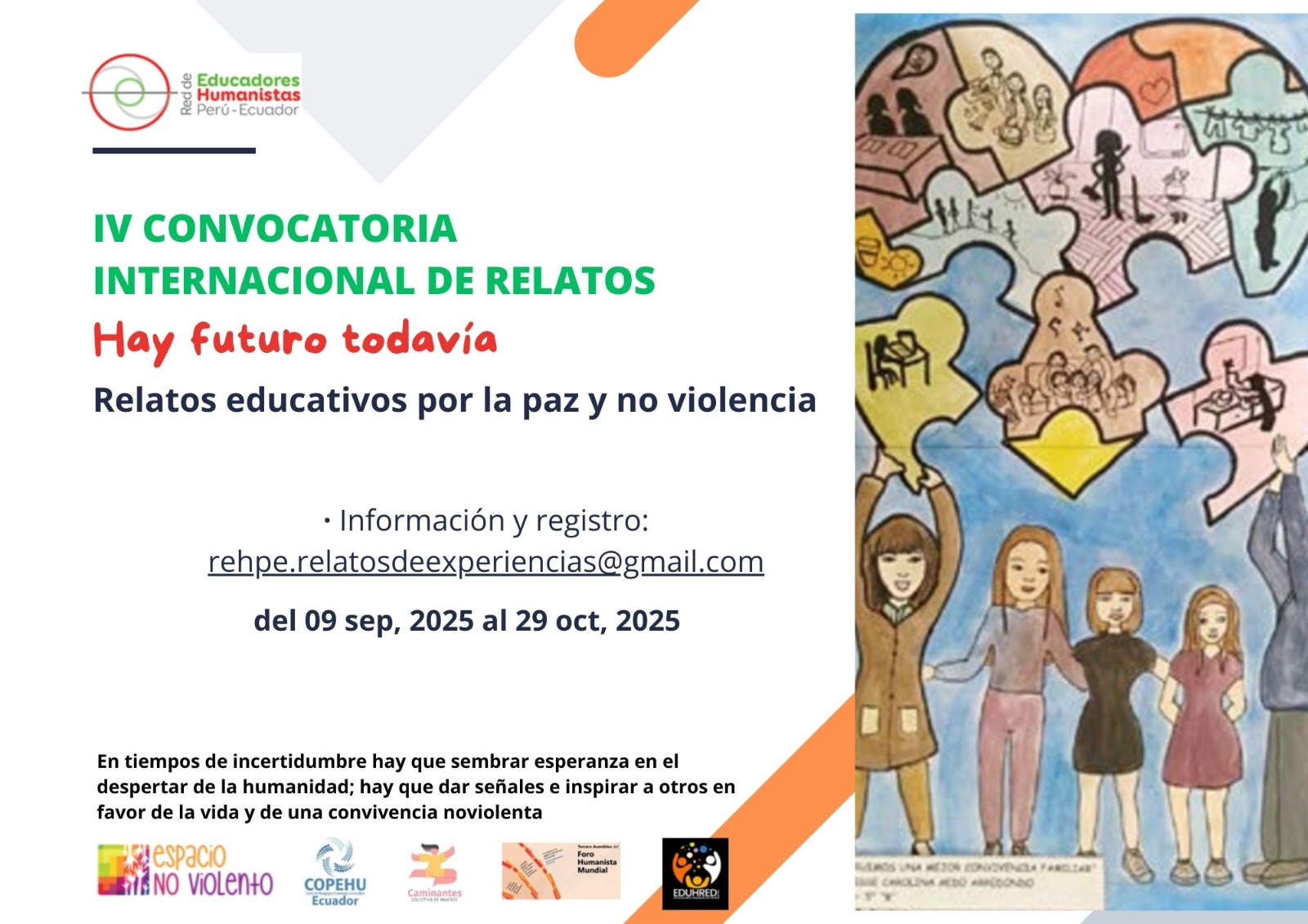 IV CONVOCATORIA INTERNACIONAL DE RELATOS POR LA PAZ Y LA NOVIOLENCIAPor sonia / 26 de septiembre de 2025 Aquí los detalles de la convocatoria. IV convocatoria- relatos 2025-final[1]